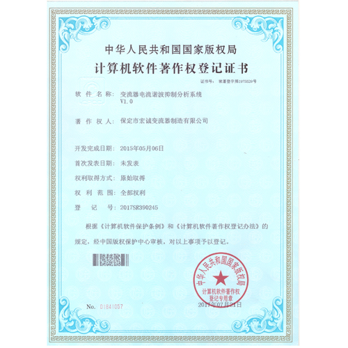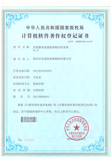 計(jì)算機(jī)軟件注冊(cè)權(quán)登記證書——變流器電流諧波抑制分析系統(tǒng)V1.0