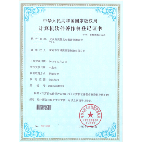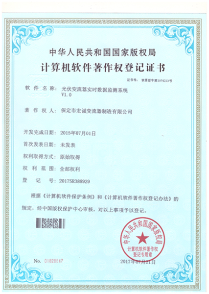 計(jì)算機(jī)軟件注冊(cè)權(quán)登記證書——光伏變流器實(shí)時(shí)數(shù)據(jù)檢測(cè)系統(tǒng)V1.0