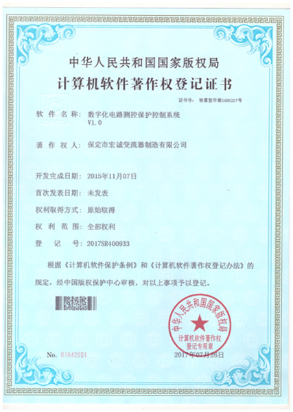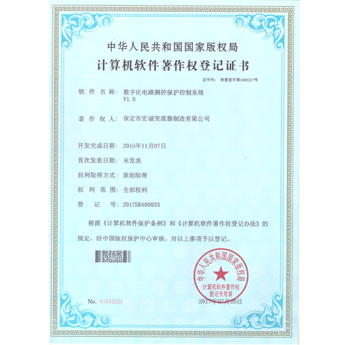計(jì)算機(jī)軟件注冊(cè)權(quán)登記證書——數(shù)字化電路測(cè)控保護(hù)控制系統(tǒng)V1.0
