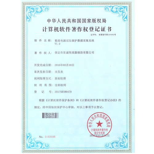 計(jì)算機(jī)軟件注冊(cè)權(quán)登記證書——整流電源過壓保護(hù)數(shù)據(jù)采集系統(tǒng)V1.0